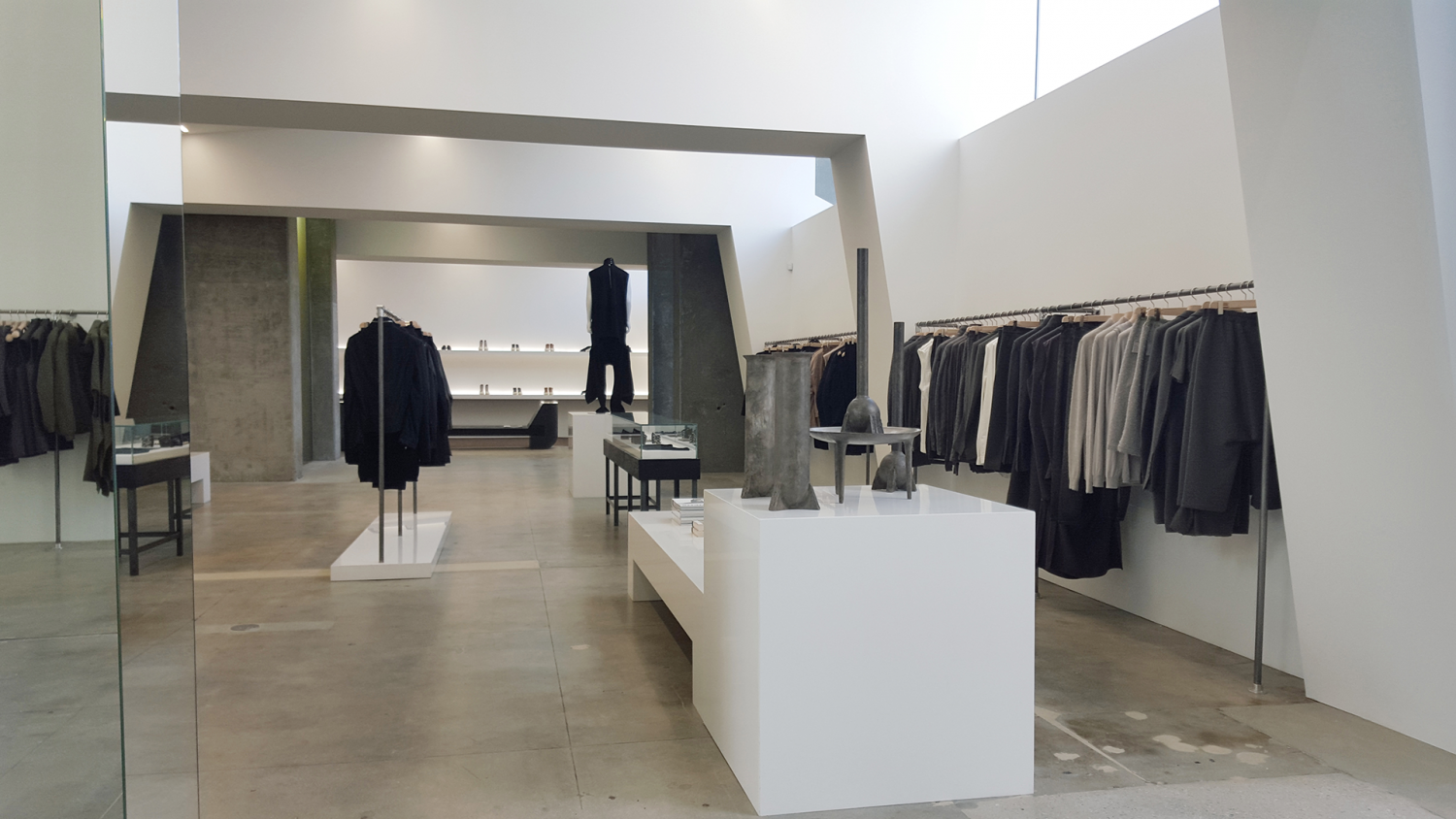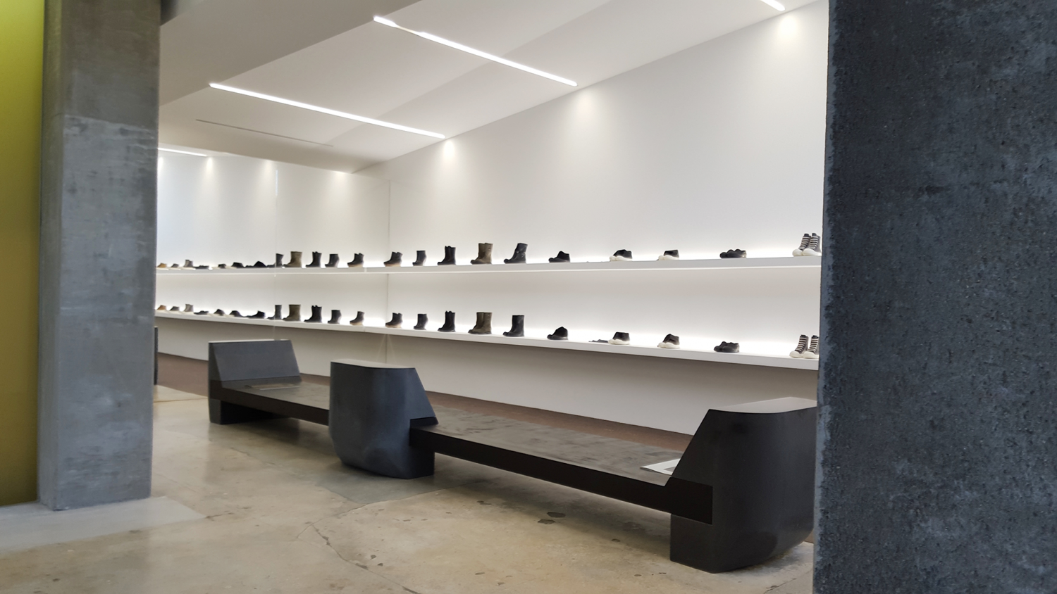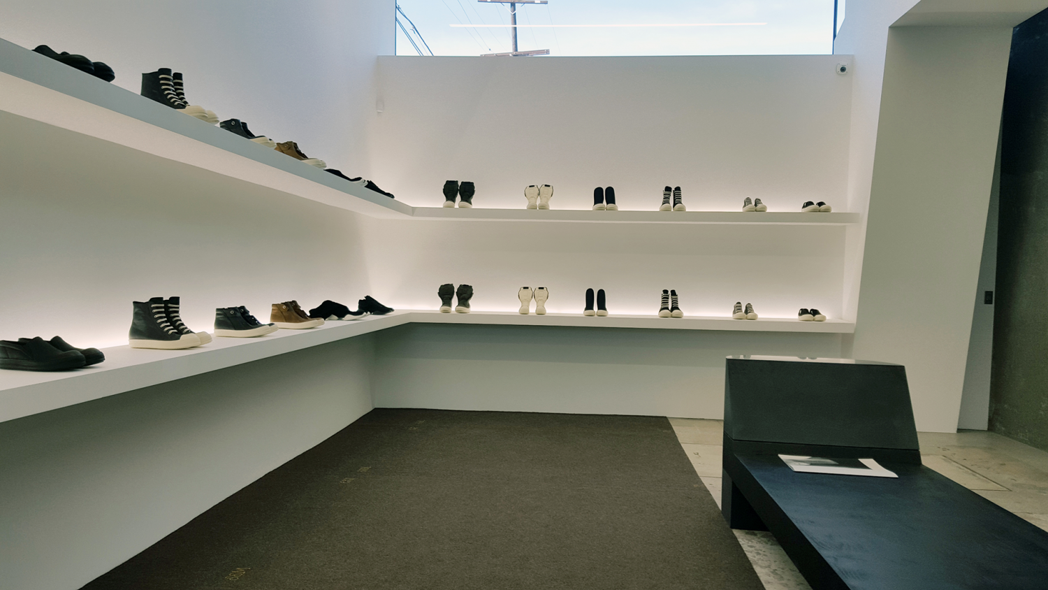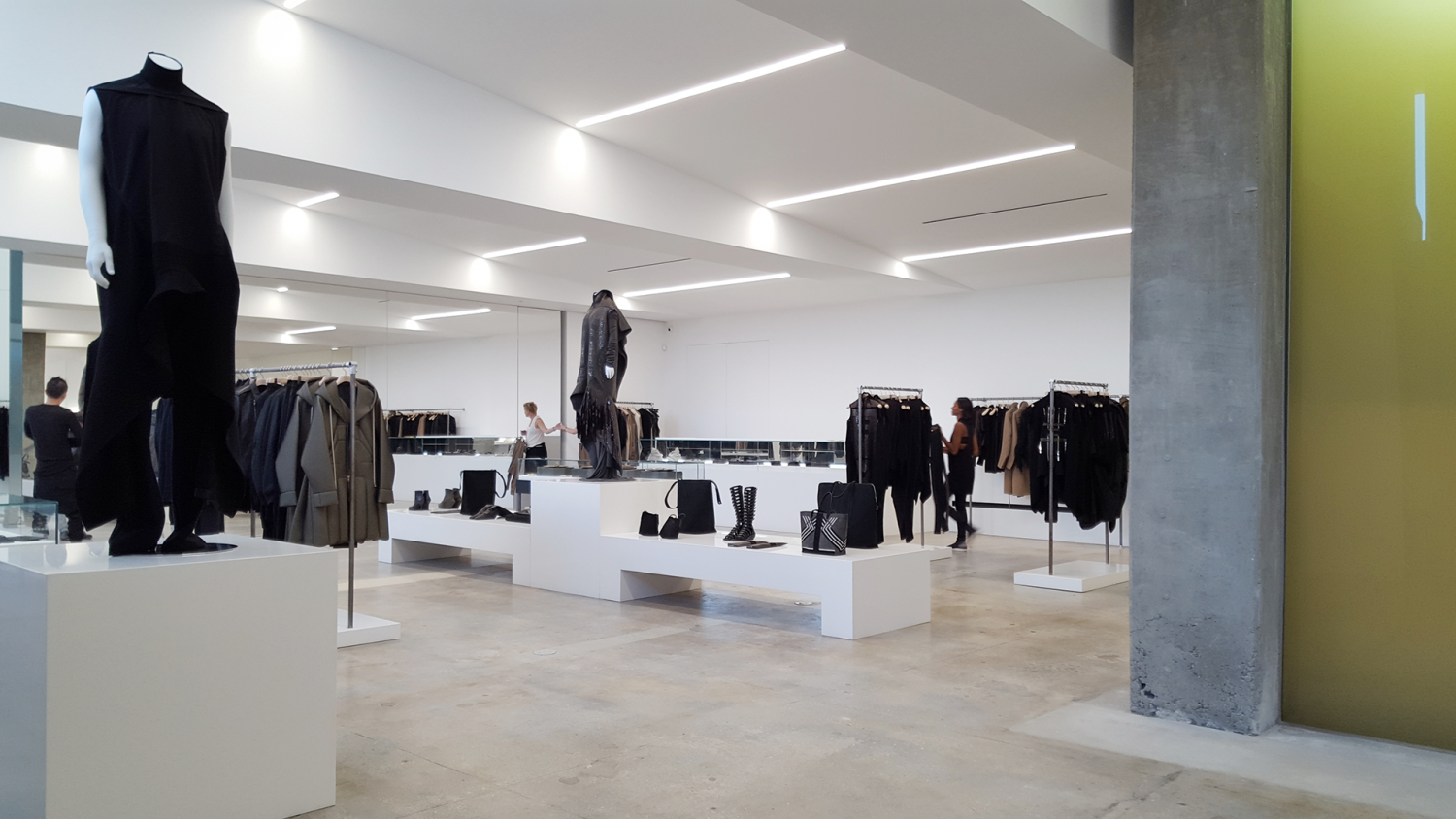 Illuminating this monochrome Flagship store in the heart of LA, drenched in California sunshine by day brought numerous challenges to providing a luminous environment that helped express the unique architecture in addition to displaying the couture clothing and accessories. Consistent with all Rick Owens stores, whimsical artistic elements reflect the iconic fashion labels' creativity. In this case, a fog wall and oil wall required special lighting attention and expertise.